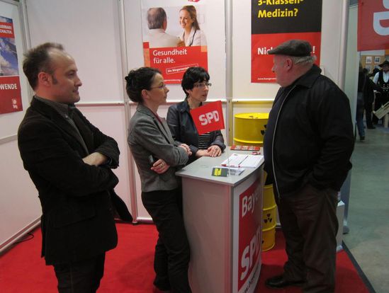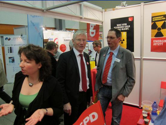 Am Sonntag nachmittag wartete dann das Standteam und viele SPD Anhänger und Messebesucher neugierig auf das Ergebnis der Landtagswahlen in Baden-Würtemberg und Rheinland-Pfalz. Es erfolgte an diesem Sonntagabend die Abwahl der baden-würtembergischen CDU nach 58 Jahren in der Regierung und ein weiterer Regierungsauftrag in Rheinland-Pfalz mit Ministerpräsident Kurt Beck. Dies ist ermutigend und wird uns als BayernSPD in unseren nächsten politischen Aktionen beflügeln. Nicht nur eine Energiewende sondern auch eine politische Kehrtwende in Bayern ist damit näher gerückt.